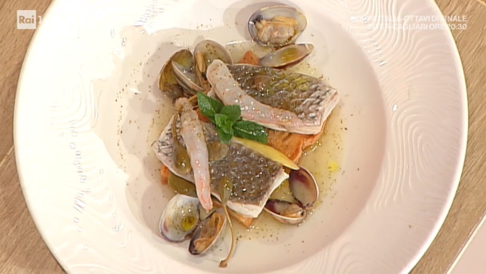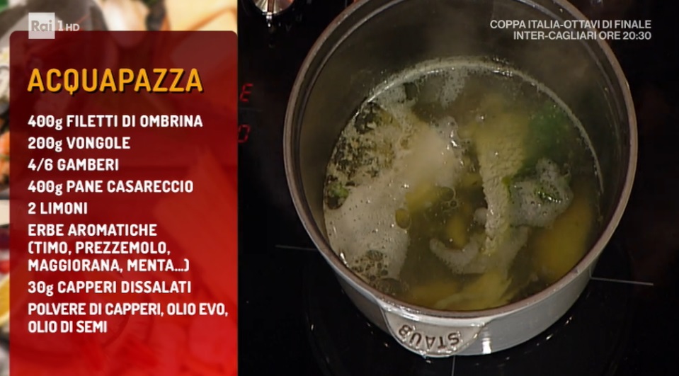 - 400 g filetti di ombrina, 200 g vongole, 4-6 gamberi, 400 g pance casereccio, 2 limoni, erbe aromatiche, 30 g capperi dissalati, polvere di capperi, olio evo, olio di semi