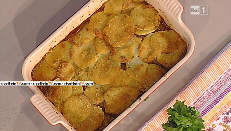 Tagliamo le braciole a cubettoni; rosoliamo in padella, con un generoso filo d’olio ed uno spicchio d’aglio, la carne: bastano pochi istanti, deve solo dorarsi leggermente su tutti i lati. Una volta rosolata, saliamo e pepiamo. Tagliamo le patate a fettine e le passiamo sotto l’acqua corrente (fredda); tritiamo il prezzemolo e lo uniamo alle patate; condiamo anche col pecorino grattugiato, l’origano secco, un pizzico di sale ed il pangrattato. Mescoliamo per bene e facciamo un primo strato di patate in una pirofila unta; mettiamo sopra tutta la carne rosolata e le rimanenti patate per coprire l’agnello; spolveriamo con altro pecorino, pangrattato ed olio. Inforniamo a 180° per 1 ora – 1 ora e mezza.