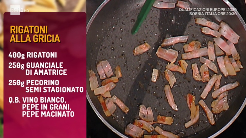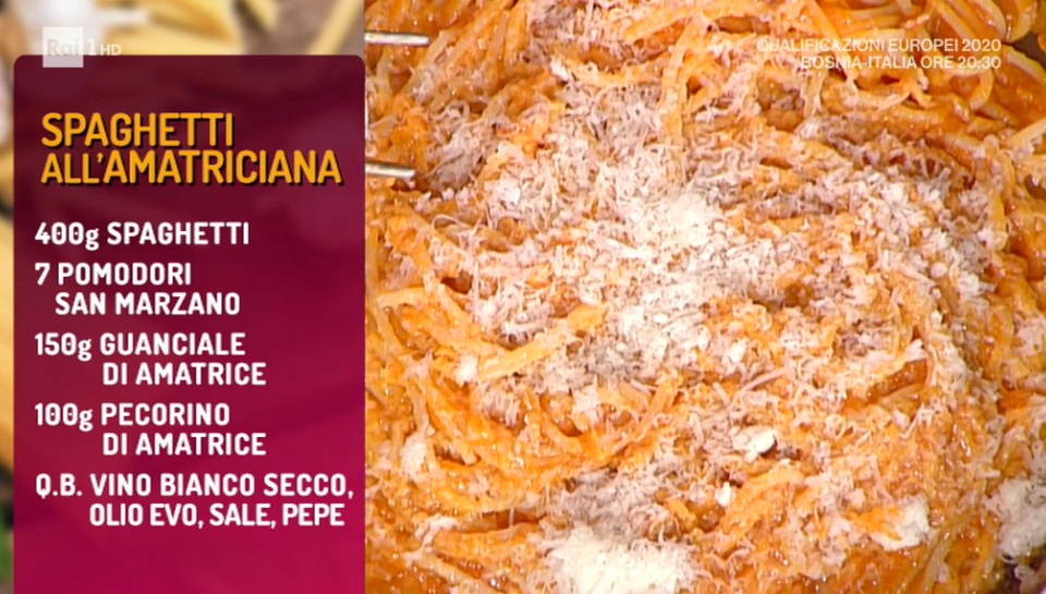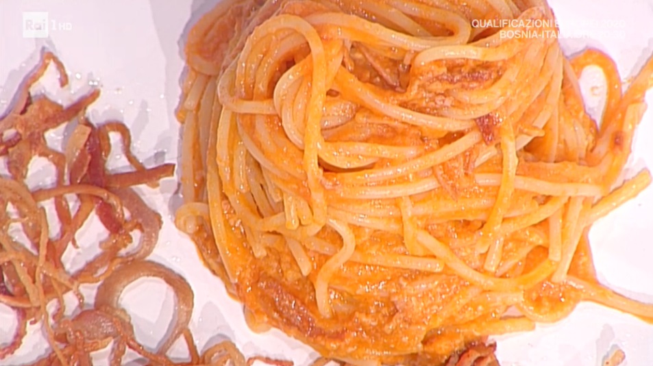 Nel duello iniziale, Gian Piero Fava e Ginevra Antonini hanno proposto due classici della cucina romana, perfetti per un ricco pranzo domenicale. Di seguito ingredienti e procedimento dell’Amatriciana e della Gricia.