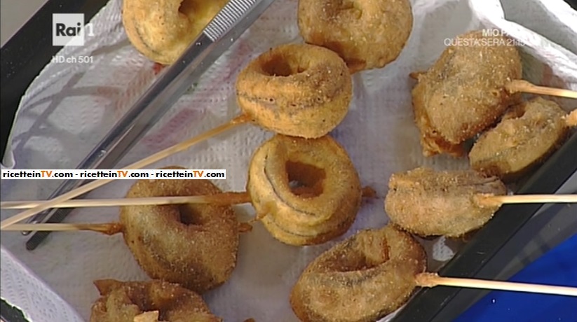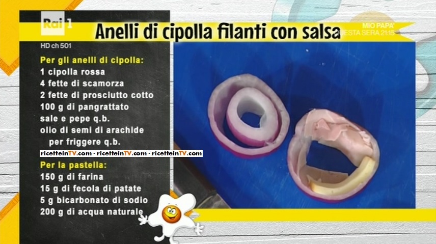 - Per gli anelli: 1 cipolla rossa, 4 fette di scamorza, 2 fette di prosciutto cotto, 100 g pangrattato, sale e pepe, olio di semi di arachide per friggere