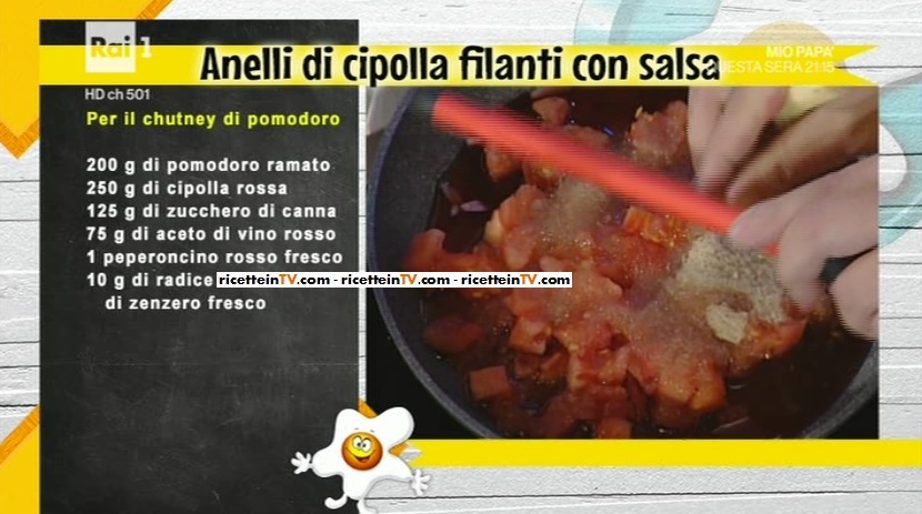 - Per la salsa: 200 g pomodoro ramato, 250 g cipolla rossa, 125 g zucchero di canna, 75 g aceto di vino rosso, 1 peperoncino rosso fresco, 10 g radice di zenzero fresco