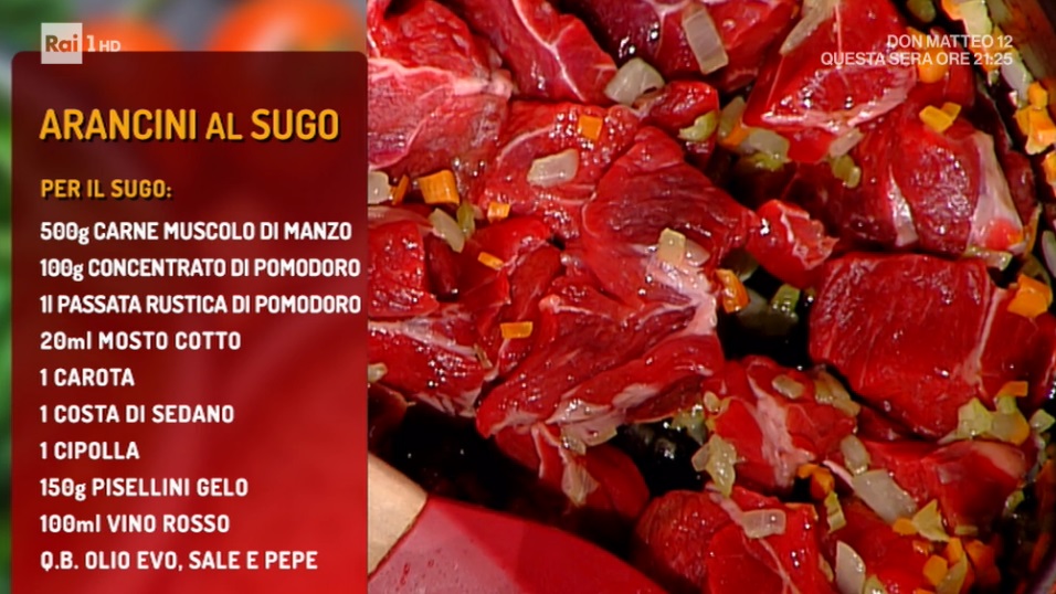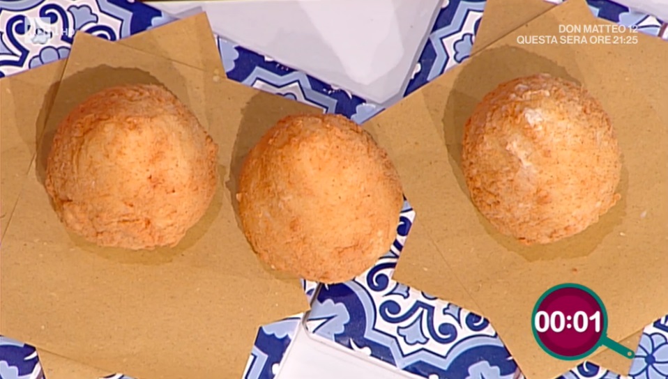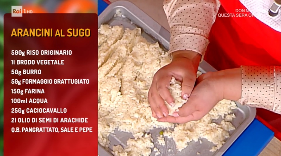 Duello iniziale all’insegna della buona cucina e della simpatia, con Natale Giunta e Valeria Raciti. I due cuochi siciliani, l’uno di Palermo, l’altra di Catania, propongono la loro personale versione dei mitici arancini. Ecco la versione di Valeria.