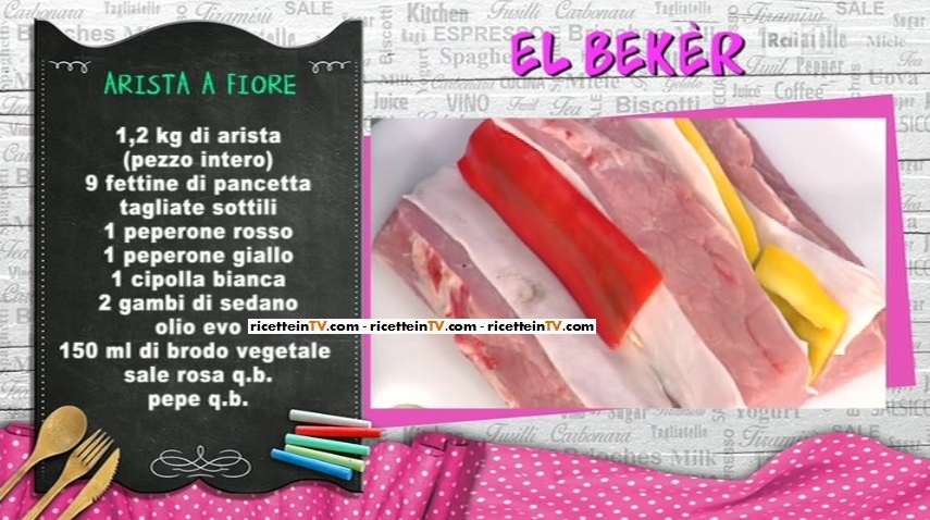 • 1,2 Kg arista (pezzo intero), 9 fettine di pancetta tagliate sottili, 1 peperone rosso, 1 peperone giallo, 1 cipolla bianca, 2 gambi di sedano, olio evo, 150 ml brodo vegetale, sale rosa, pepe