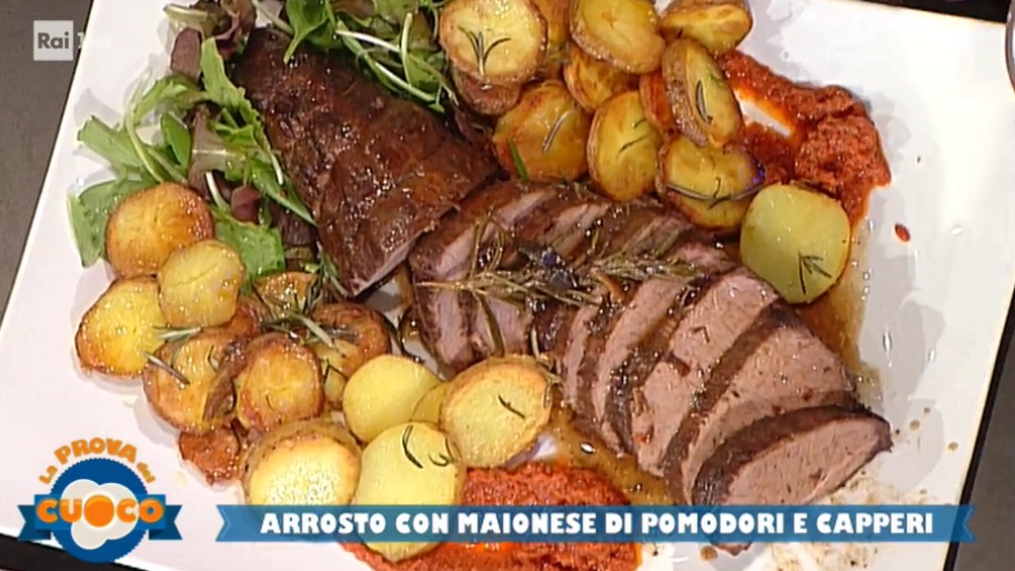 - 1 Kg di noce o cimalino di manzo, 2 spicchi d’aglio, 3 rametti di rosmarino, 2 bicchieri di vino rosso, 500 g patate lesse, 300 g pomodori secchi sott’olio, 50 g capperi, 100 g misticanza, brodo di carne, sale e olio evo