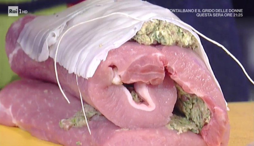 Apriamo la carne, la lonza di maiale, a libro e la disponiamo su un piano. In un mixer, tritiamo l’aglio con il prezzemolo, il rosmarino, dei tocchi di carne (di lonza), del lardo, del prosciutto crudo a cubetti e frulliamo finemente. Spalmiamo il composto ottenuto sulla lonza aperta a libro. Facciamo attenzione a disporre su tutta la superficie. Teniamone da parte un po’ per l’esterno. Arrotoliamo la carne e spalmiamo sopra il trito rimasto. Infine, copriamo con altre fettine di lardo. Leghiamo con lo spago.