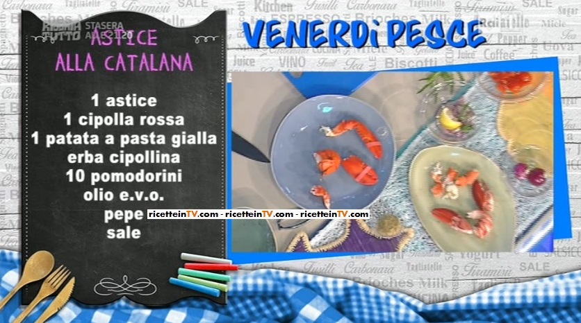 - 1 astice, 1 cipolla rossa, 1 patata, erba cipollina, 10 pomodorini, olio evo, pepe, sale
