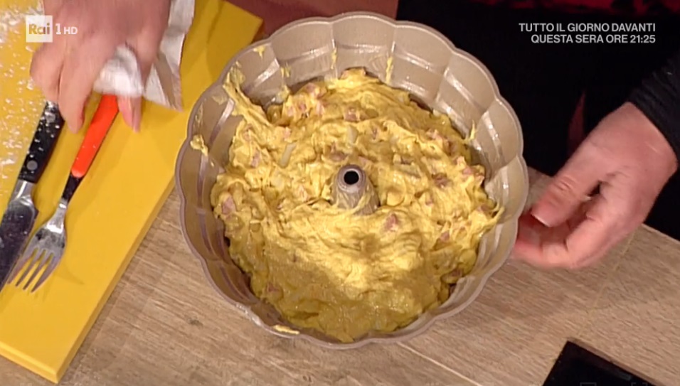 Ottenuto un impasto senza grumi, inseriamo anche la mortadella, il prosciutto cotto e la scamorza a cubetti piccoli. Mescoliamo in modo da distribuire uniformemente i salumi e la scamorza.