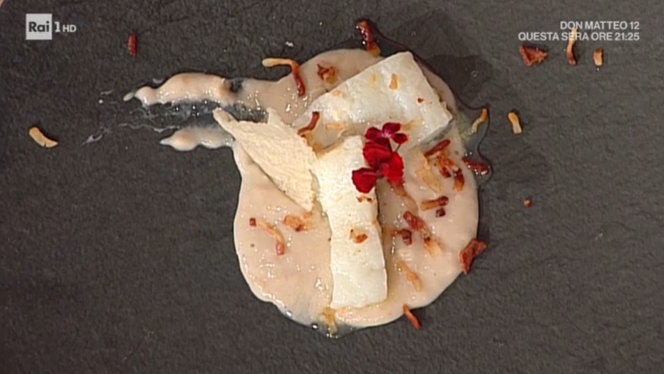 Creiamo sul piatto uno specchio di crema di fagioli. Adagiamo sopra il baccalà e finiamo con la pancetta croccante, un filo d’olio ed i fiori di rosmarino.