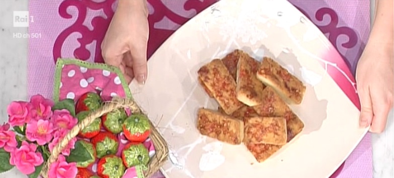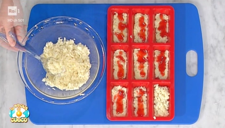 Con una grattugia a fori grossi, grattugiamo i panetti di frolla. Mettiamo la frolla grattugiata alla base di stampini in silicone rettangolari. Pressiamo leggermente con un cucchiaio. Mettiamo sopra una cucchiaiata di confettura di fragole fredda. Copriamo con altra frolla grattugiata. Mettiamo sopra altra confettura. Inforniamo a 170° per 50 minuti. Sformiamo da freddi.