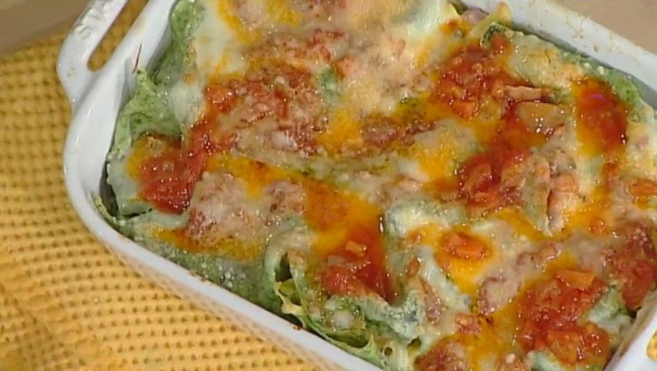 - 600 g di farina, 5 uova, 50 g di spinaci cotti e strizzati, 300 g di prosciutto cotto, 200 g di funghi di bosco, 100 g di burro, mezzo litro di latte, 50 g di burro, 25 g di farina, 100 g di formaggio grattugiato, 100 g di sedano carota e cipolla tritati, 150 g di pomodori pelati, sale, pepe, noce moscata qb