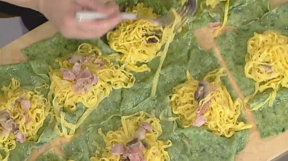 Facciamo due tipi di sfoglia: una classica, solo con uova e farina, l’altra verde, aggiungendo all’impasto anche gli spinaci lessati e strizzati. Stendiamo la sfoglia verde, la tagliamo in rettangoloni. Li sbollentiamo qualche secondo poi li raffreddiamo in acqua fredda e salata. Quindi scoliamo e asciughiamo.