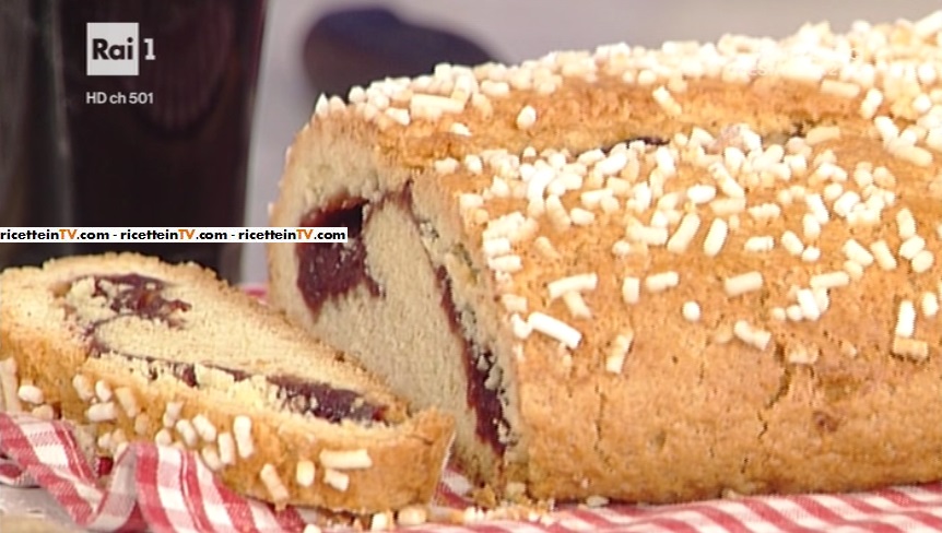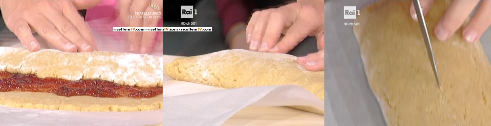 Stendiamo sopra un generoso strato di confettura di amarene o prugne, dev’essere una confettura non troppo dolce. Possiamo sostituire con della crema al cioccolato spalmabile. Lasciamo libero 1 cm dal bordo. Quindi, arrotoliamo. Come? Facendo 3 pieghe (foto). Ripieghiamo un lato verso il centro. Sovrapponiamo l’altro lembo. Quindi capovolgiamo l’intero rotolo, in modo da rivolgere la congiuntura verso il basso. Con un coltello affilato, incidiamo leggermente la superficie. Un taglio lungo e dritto. Spennelliamo con latte e spolveriamo con granella di zucchero o semplicemente zucchero semolato. Inforniamo 45 minuti a 170°.