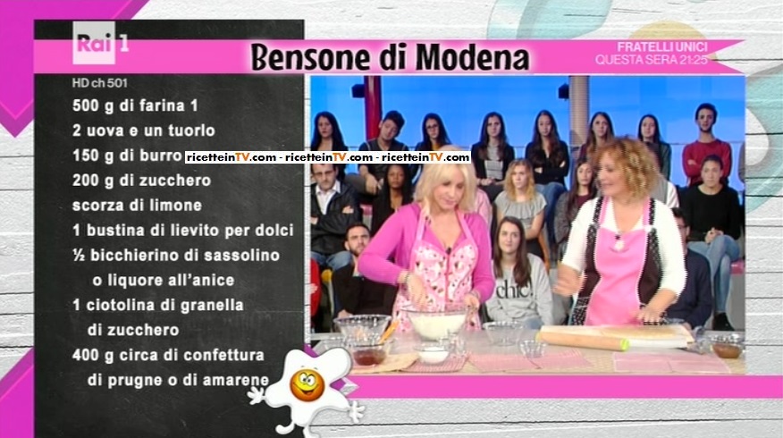 Dopo il primo piatto di Marco Bianchi ed il secondo di Anna Moroni, Natalia Cattelani prepara il dolce! L’abile cuoca, con il consueto piglio materno, propone un dolce adatto a tutta la famiglia. Facile e goloso. Prepariamo il bensone di Modena, un biscottone tipico dell’Emilia.