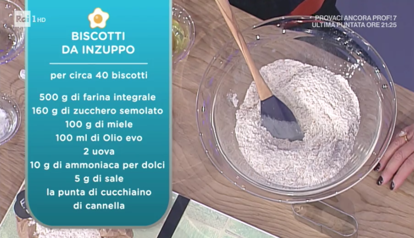 Annina Moroni riapre la sua pasticceria casalinga per preparare dei biscotti casalinghi da… inzuppo! Dopo innumerevoli doppi sensi, che porta Antonella a chiedere a Federico se ‘ogni tanto pucci il biscotto?‘, prepariamo i biscotti da inzuppo.