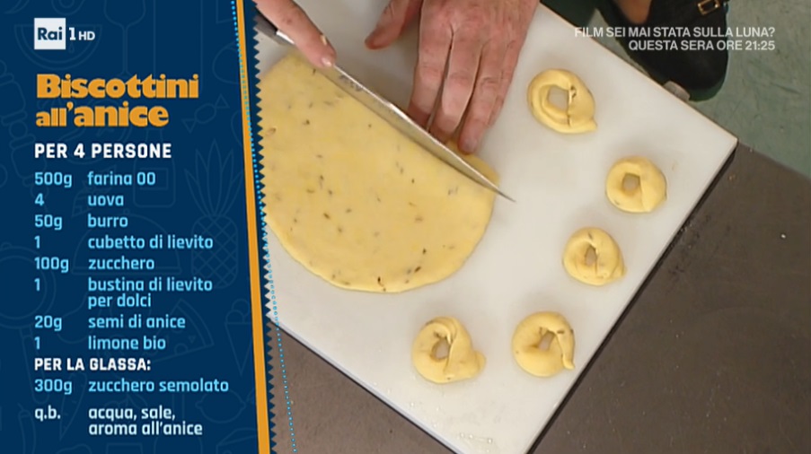 - 500 g farina 00, 4 uova, 50 g burro, 100 g zucchero, 1 bustina di lievito per dolci, 20 g semi di anice, aroma anice, 1 limone