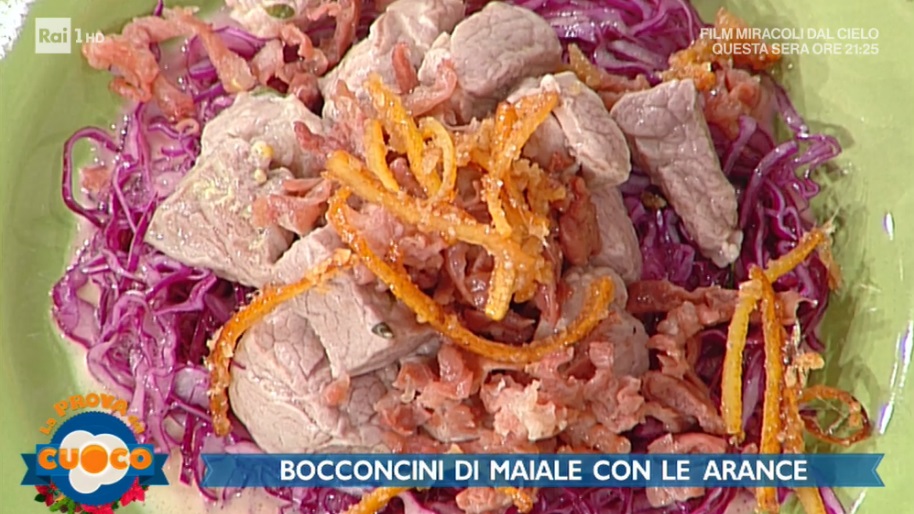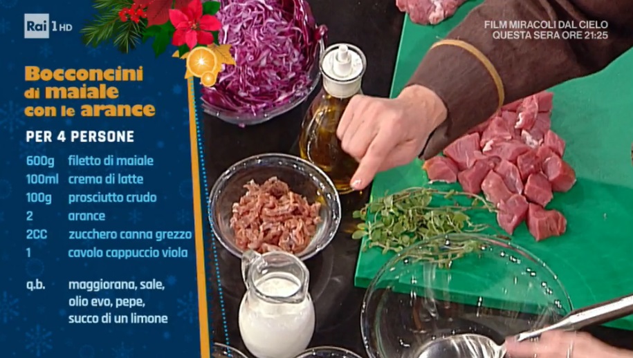 - 600 g filetto di maiale, 100 g crema di latte (panna), 100 g prosciutto crudo, 2 arance, 2 cc zucchero di canna, 1 cavolo cappuccio viola, maggiorana, sale, olio evo, pepe, succo di un limone