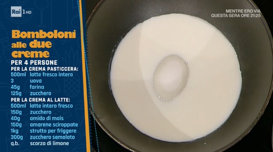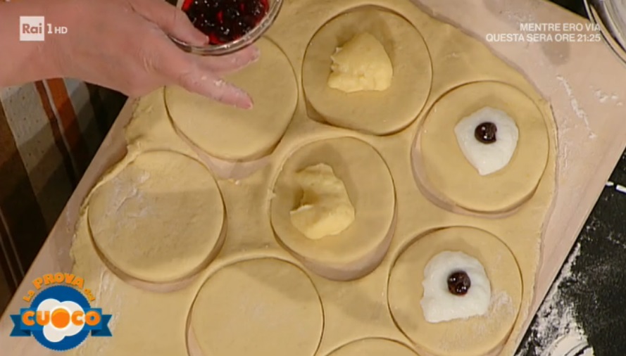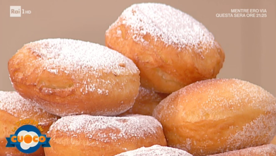 Stendiamo l’impasto lievitato con il mattarello. Ricaviamo dei dischi e al centro di ogni disco mettiamo la crema, pasticcera o al latte con un’amarena sciroppata. Copriamo il ripieno con un altro disco di pasta e sigilliamo bene i bordi. Eliminiamo la pasta in eccesso con un coppapasta. Copriamo e lasciamo lievitare ancora 2 ore. Una volta lievitati, tuffiamo in olio (o strutto) caldo e profondo fino a doratura. Lasciamo asciugare su carta assorbente e passiamo nello zucchero semolato.
