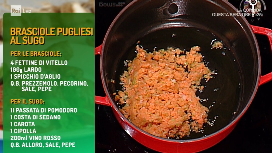 In un tegame, facciamo soffriggere un trito fine di sedano, carota e cipolla con un generoso filo d’olio. Mettiamo a rosolare gli involtini su tutti i lati, quindi sfumiamo con il vino rosso. A questo punto, aggiungiamo la passata di pomodoro ed una foglia di alloro. Quando il sugo bolle, abbassiamo la fiamma, copriamo e lasciamo cuocere a fuoco lento per 2-3 ore.
