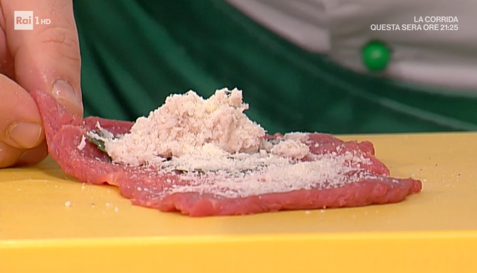 Tritiamo finemente il lardo con l’aglio ed il prezzemolo. Battiamo le fettine di vitello e posizioniamo sopra una noce di trito al lardo. Continuiamo con una spolverata di pecorino, sale, pepe e richiudiamo ad involtino, usando uno stuzzicadenti per fissare le estremità.