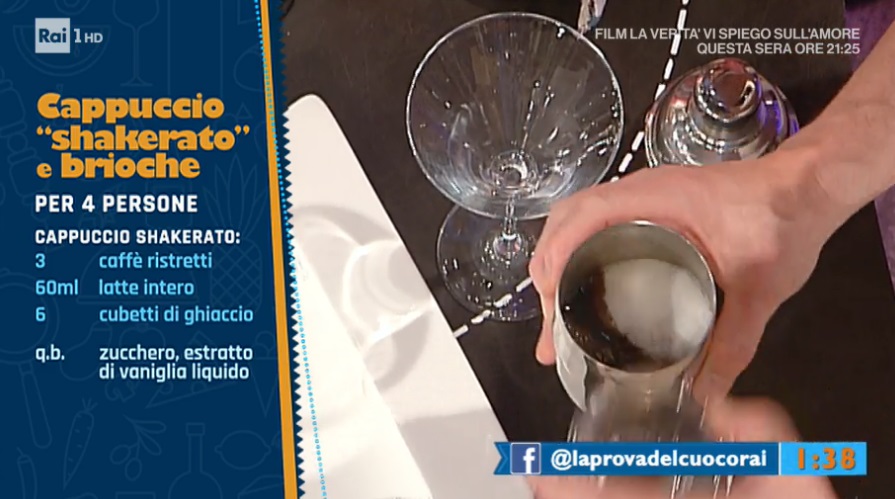 - Cappuccio: 3 caffè ristretti, 60 ml latte, 6 cubetti di ghiaccio, zucchero, estratto di vaniglia liquido