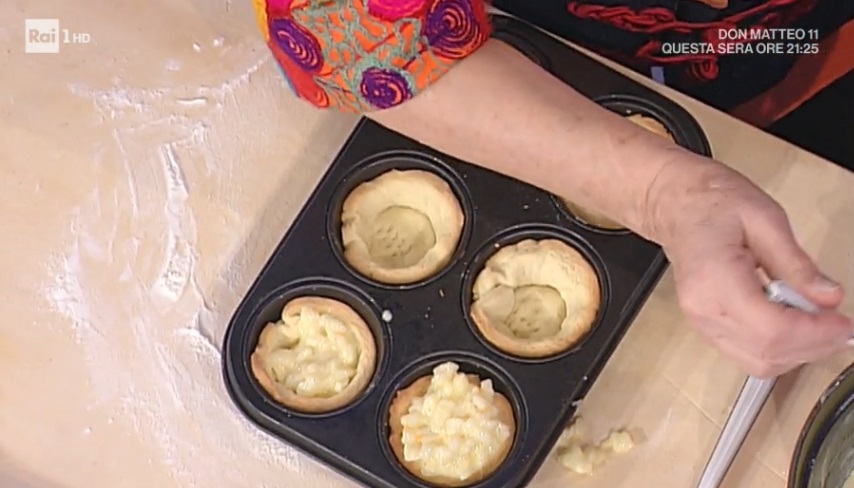 Imburriamo degli stampini da muffin. Stendiamo la frolla a 3-4 mm. Ricaviamo dei dischetti e li inseriamo negli stampini da muffin. Bucherelliamo con una forchetta ed inforniamo per 10-12 minuti a 200°.