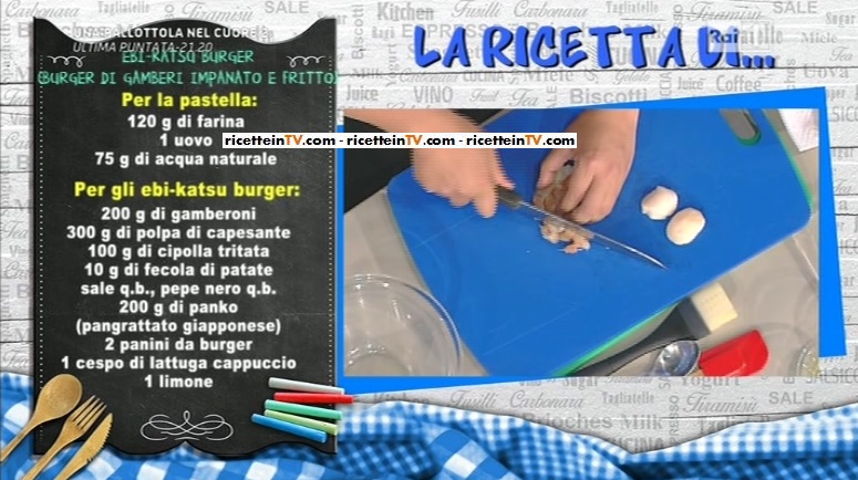 • Per i burger: 200 g gamberoni, 300 g polpa di capesante, 100 g cipolla tritata, 10 g fecola di patate, sale, pepe nero, 200 g panko (pangrattato giapponese), 2 panini da burger, 1 cespo di lattuga cappuccio, 1 limone