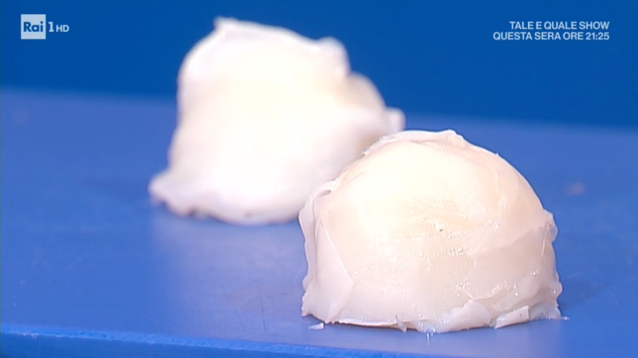 Portiamo a bollore una pentola d’acqua salata. Immergiamo i fileti di calamaro per 10 secondi (contiamo fino a 10). Scoliamo ed immergiamo subito in acqua e ghiaccio salata. Lo asciughiamo con un pezzo di carta assorbente e lo strofiniamo, in modo da eliminare le pellicine. A questo punto, possiamo anche decidere di congelarlo. Oppure, lo tagliamo a fettine sottilissime, come fosse un carpaccio di carne. Otterremo dei petali, che disponiamo a spirale, a formare un rosa. Ne otterremo 4.