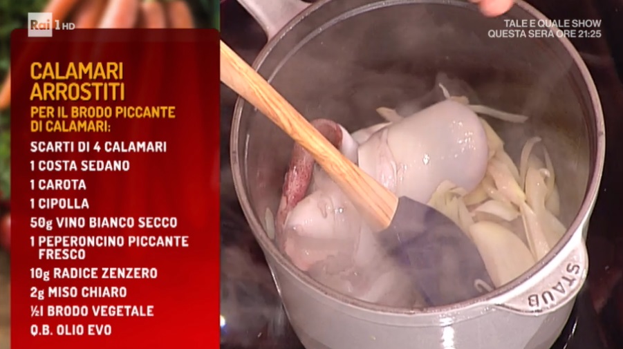 - Brodo: scarti di 4 calamari, 1 costa di sedano, 1 carota, 1 cipolla, 50 g vino bianco, 1 peperoncino fresco, 10 g radice di zenzero, 2 g miso chiaro, mezzo l brodo vegetale, olio evo
