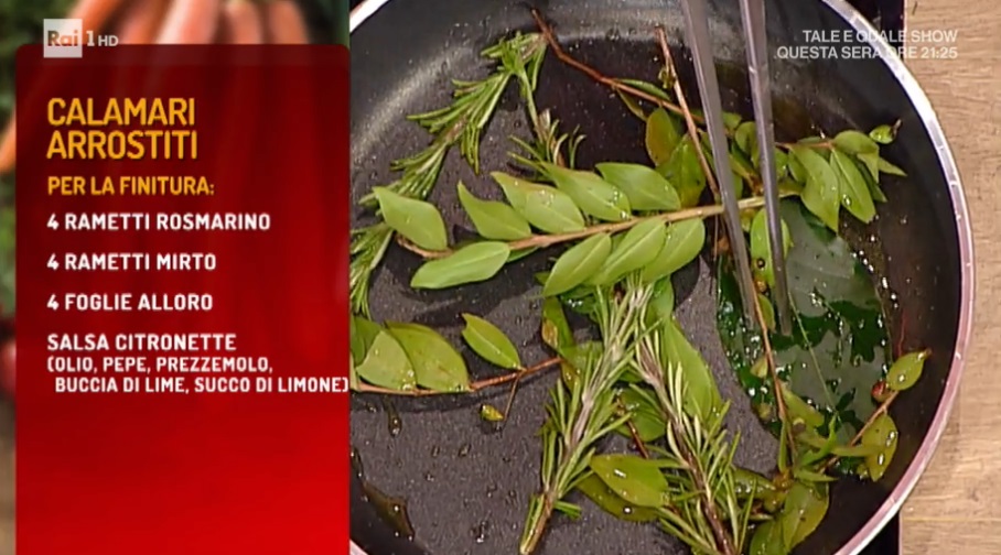 In padella, scaldiamo un filo d’olio con le erbe aromatiche, alloro, rosmarino ed altre a piacere. Eliminiamo le erbe e le mettiamo sul piatto da portata. Nella stessa padella, quindi, facciamo dorare le rose di calamaro solo su un lato. Serviamo le rose sulle erbe arrostite. Le irroriamo con la citronette (sopra ingredienti per realizzarla). Serviamo a fianco il brodo piccante.
