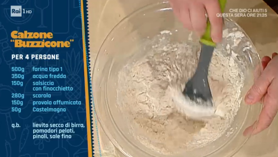 - 500 g farina tipo 1, 350 g acqua fredda, 15 g sale fino, 3 g lievito secco di birra, 150 g salsiccia, 280 g scarola, 150 g provola affumicata, 50 g castelmagno, pomodori pelati, pinoli