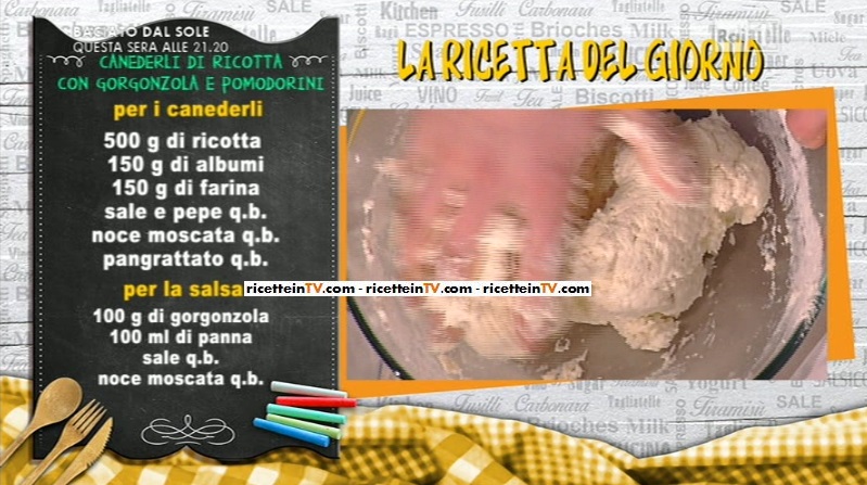 La ricetta del giorno, che apre la puntata odierna, è di Marcus Holzer, lo chef del Sudtirol. Oggi, un classico dei classici, i canederli. Dunque, ecco la ricetta dei canederli di ricotta con gorgonzola e pomodorini.