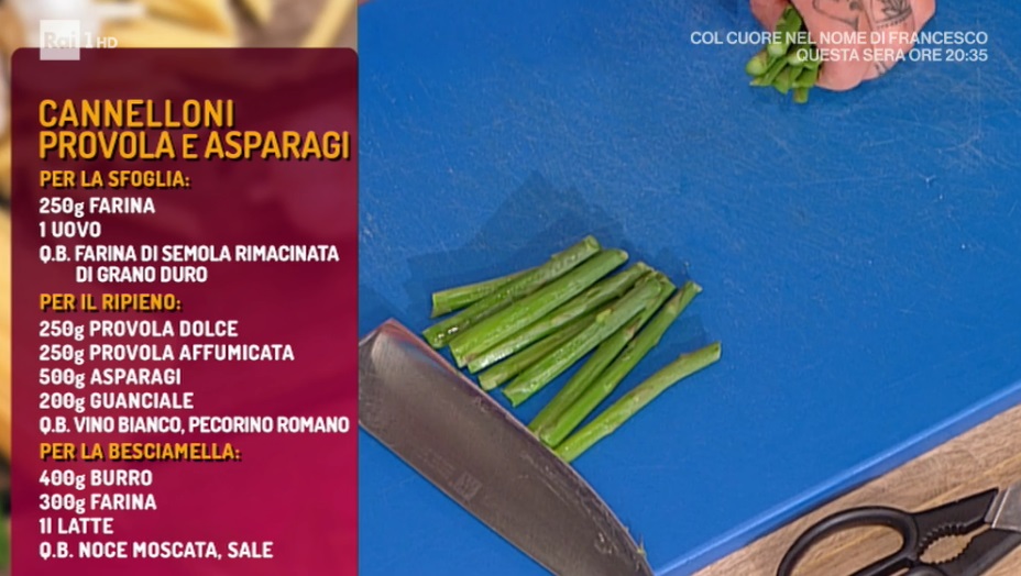 - Ripieno: 250 g provola dolce, 250 g provola affumicata, 500 g asparagi, 200 g guanciale, vino bianco, pecorino romano