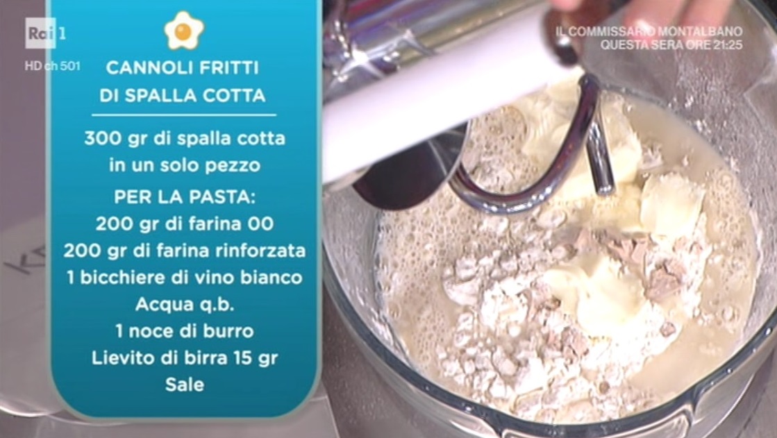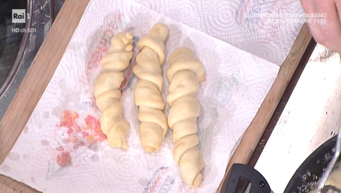 Facciamo l’impasto mettendo nella planetaria le due farine, il lievito di birra, il burro morbido a tocchetti, un goccio di vino bianco ed acqua quanto basta. Azioniamo ed impastiamo il tutto. Una volta che il tutto è ben amalgamato, lavoriamo con le mani, mettiamo in una boulle, copriamo con carta trasparente e lasciamo lievitare per 4 ore.