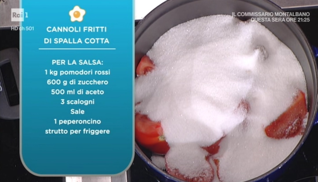 Prepariamo una salsa agrodolce mettendo a cuocere 1 kg di pomodori puliti tagliati a fette con 600 di zucchero, 500 ml di aceto bianco, 3 scalogni tagliati a pezzetti e un pizzico di peperoncino. Facciamo bollire il tutto per tanto tempo, poi frulliamo.