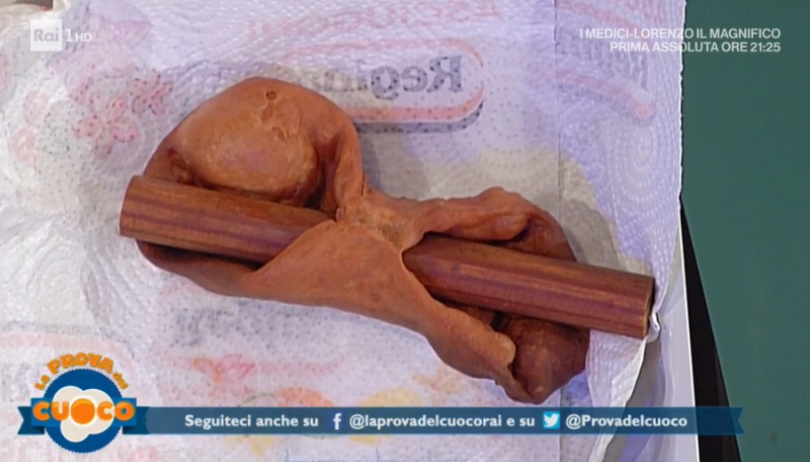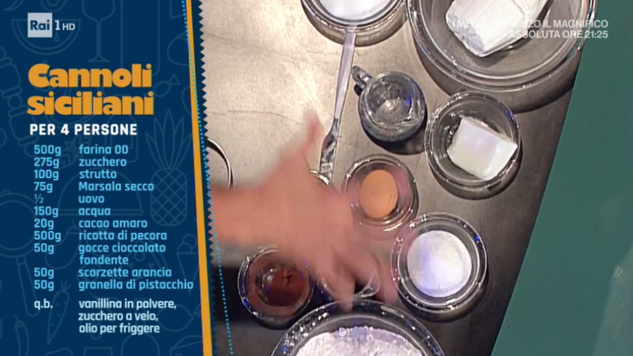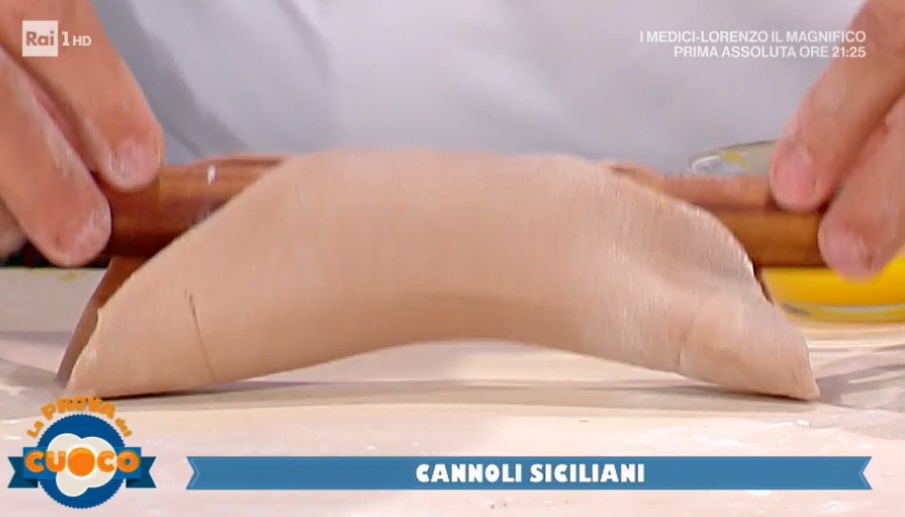 Partiamo dall’impasto delle cialde. In una ciotola mettiamo la farina con il cacao, lo zucchero (125 g), il marsala, la vaniglia, lo strutto morbido, mezzo uovo e l’acqua. Lavoriamo, con il gancio se usiamo l’impastatrice, altrimenti a mano, fino ad ottenere un composto liscio ed omogeneo. Avvolgiamo l’impasto nella pellicola e lasciamo riposare in frigorifero per 1 ora almeno. Trascorso il periodo di riposo, tiriamo una sfoglia sottile (3 mm circa). Natale ricava delle palline e le stende con il mattarello, in modo da ottenere degli ovali. Posizioniamo al centro una ‘canna’ per cannolo. Avvolgiamo sulla ‘canna’ l’impasto, fermando le due estremità con un po’ d’uovo sbattuto. Non dobbiamo avvolgere la sfoglia troppo stretta. A questo punto immergiamo la cialda, insieme alla ‘canna’, in olio profondo e bollente. Una volta dorata, la scoliamo e la facciamo asciugare su carta assorbente. Estraiamo la ‘canna’ e lasciamo raffreddare.