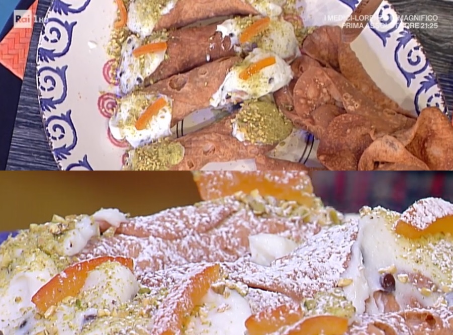 Riempiamo le cialde ormai fredde con la crema di ricotta. Decoriamo con l’arancia candita e la granella di pistacchio. Finiamo con zucchero a velo.