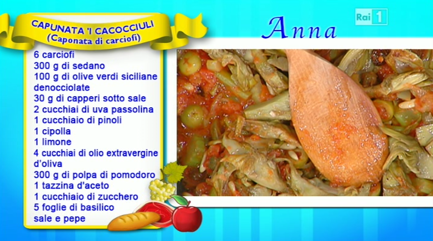 Anna raccomanda di preparare la caponata un giorno prima. Quindi, spiega come preparare la “sua” caponata. Priviamo i carciofi delle foglie, li passiamo in acqua e limone. Quindi, tagliamo gli stessi a spicchi e li stufiamo in padella, con un filo d’olio e l’aglio, per 15 minuti. Sbollentiamo il sedano, anch’esso tagliato a tocchetti. Lo mettiamo in padella, con un filo d’olio, la cipolla, i capperi dissalati, la polpa di pomodoro, l’uva passolina, le olive tagliate a metà ed i pinoli. Quindi, uniamo i carciofi e rendiamo il tutto agrodolce aggiungendo aceto e zucchero.