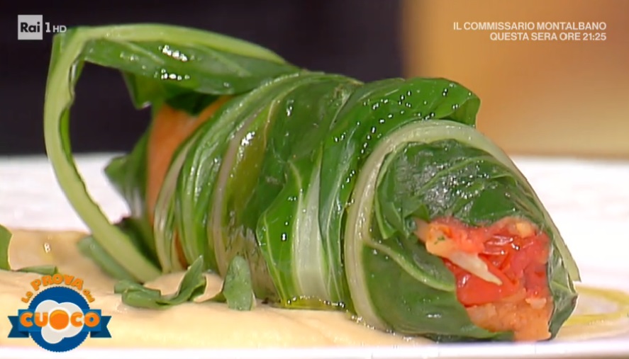 Su un foglio di pellicola, disponiamo le foglie di bieta sbollentate, e adagiamo al centro il rotolino di patate e pomodoro. Avvolgiamo stretto con le foglie di bieta, aiutandoci con la pellicola. Rosoliamo in padella con un filo d’olio e serviamo su un letto di crema di ceci con un filo d’olio.