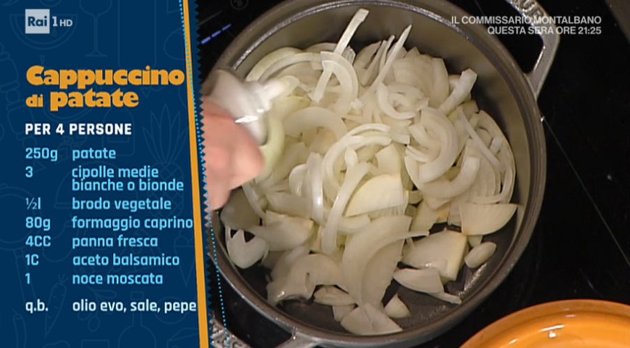 - 250 g patate, 3 cipolle bianche o bionde, mezzo l brodo vegetale, 80 g formaggio caprino, 4 cc panna fresca, 1 c aceto balsamico, 1 noce moscata, olio, sale e pepe