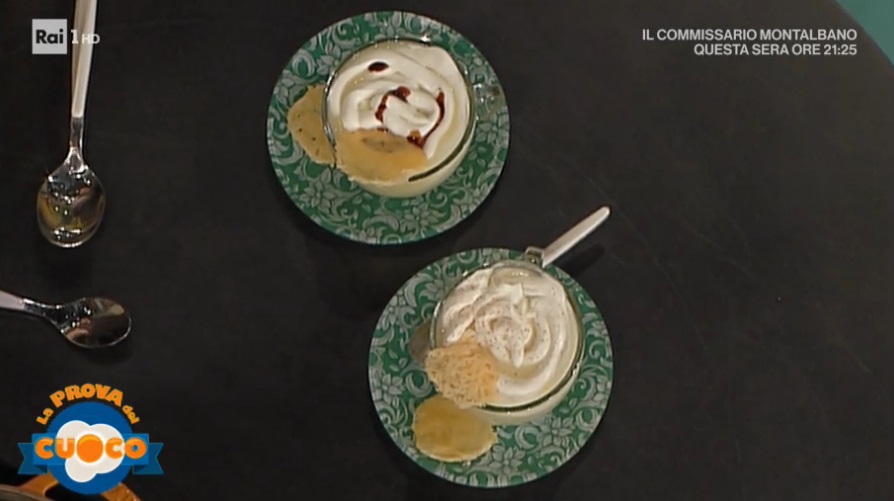 In una tazza, quindi, mettiamo la vellutata di patate. Copriamo con uno strato di crema di caprino. Spolveriamo con la noce moscata e finiamo con qualche goccia di aceto balsamico ed una cialda di formaggio stagionato.