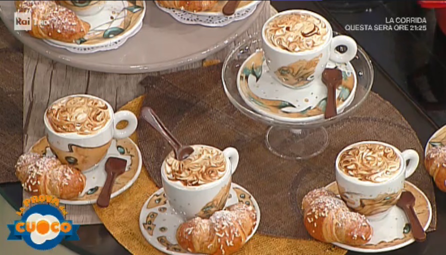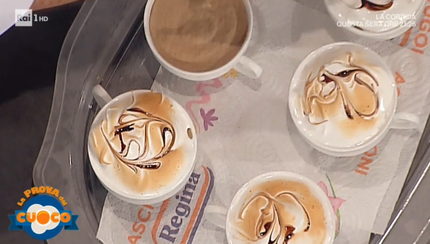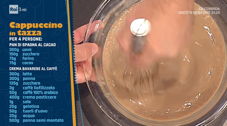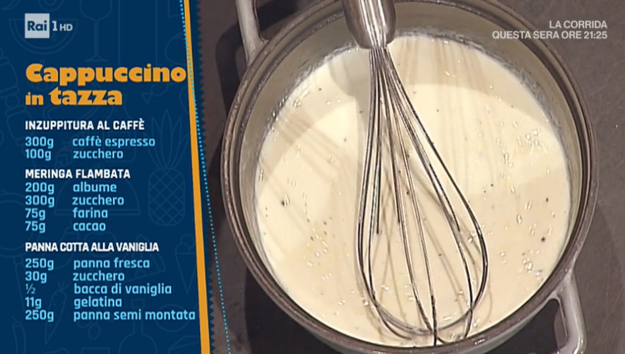 Partiamo dalla panno cotta. Portiamo a bollore la panna con lo zucchero. Profumiamo con la vaniglia, quindi uniamo la gelatina reidratata e mescoliamo fino a scioglierla. Quando raggiunge i 28°, incorporiamo la panna semi montata. Coliamo il composto all’interno di stampini in silicone a semisfera o di altra forma, l’importante è che siano piccoli: sarà il cuore del cappuccino. Congeliamo.