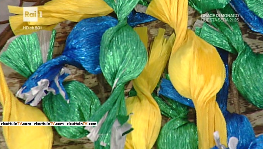 Daniele le presenta in modo creativo: avvolge ciascuna caramella nella carta alluminio, quindi in rettangolini di carta crespa colorata.