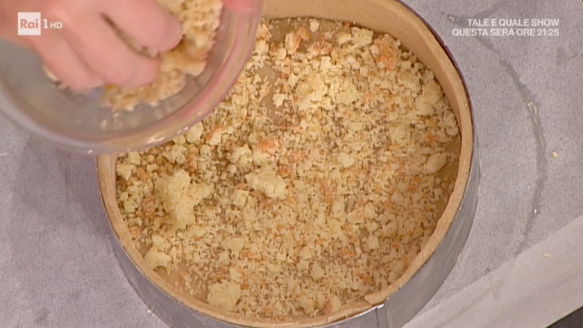 Stendiamo la frolla all’altezza di 3-4 mm. La inseriamo all’interno di una tortiera o di un anello. A questo punto, Rita consiglia di passare il guscio di frolla in congelatore. Sul fondo, spargiamo delle briciole di pan di Spagna avanzato. Spalmiamo sopra il ripieno di ricotta.