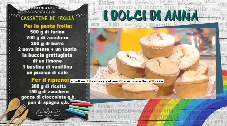 cassatine2Infine, la ricetta più attesa, quella di Anna Moroni, che oggi prepara il suo dolce sciuè sciuè. Un classico della pasticceria nostrana, di origini sicule; ecco la ricetta delle cassatine di frolla.