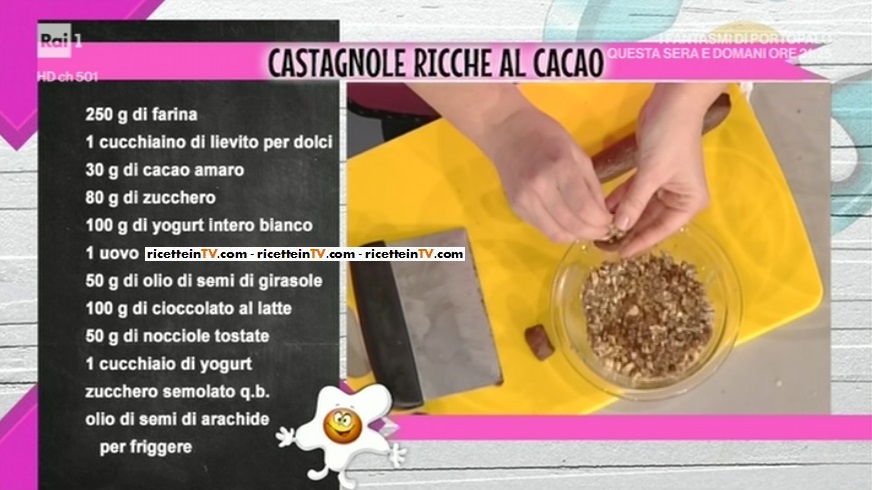 Infine, il dolce! Come ogni lunedì, dietro la piccola pasticceria casalinga de La prova del cuoco, ritroviamo la fantasiosa Natalia Cattelani. Oggi, la simpatica Natalia ci prepara un dolcetto di carnevale, una variante delle classiche castagnole. Prepariamo le castagnole ricche al cacao.