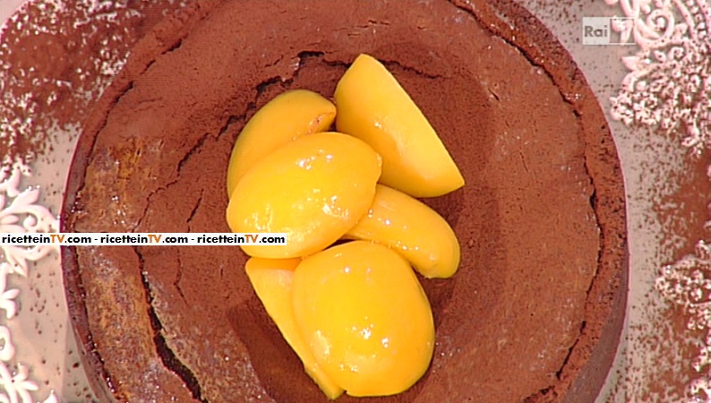 Per il ripieno, mescoliamo lo yogurt greco (ma potete variare con altri tipi di yogurt bianchi e senza zucchero) con le uova ed i semi di una bacca di vaniglia. Ottenuta una crema omogenea, uniamo il formaggio spalmabile (o la ricotta setacciata, che però rimane un po’ granulosa). Aggiungiamo anche lo zucchero; a parte, sciogliamo il caffè solubile nel caffè espresso e nel liquore al caffè; uniamo questa miscela alla crema. Mescoliamo per bene. Sciogliamo il cioccolato fondente a bagnomaria e lo uniamo alla crema. Trasferiamo tutta la crema all’interno del guscio di biscotti, quindi inforniamo a 165° per 1 ora / 1 ora e 15 minuti. Una volta fredda, la mettiamo in frigorifero. Decoriamo con cacao in polvere e pesche sciroppate a fette.