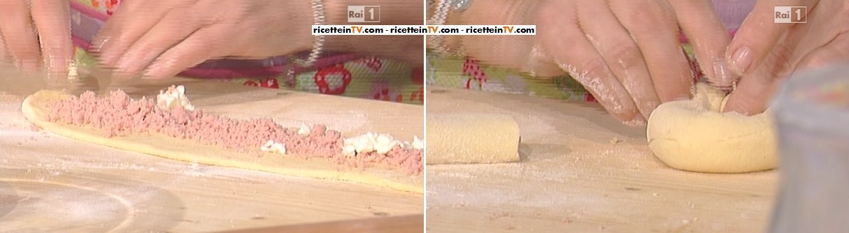 Schiacciamo le patate pelate e lesse quando sono ancora calde. Sciogliamo dolcemente il burro. Quindi, cominciamo il nostro impasto: uniamo farina e purea di patate; aggiungiamo il lievito per torte salate, l’uovo, il burro fuso, il parmigiano grattugiato ed il sale; impastiamo per bene, fino ad ottenere un composto omogeneo e compatto. Tagliamo la mozzarella a cubetti piccolissimi; tritiamo anche il prosciutto cotto. Quindi, ricaviamo dei salsicciotti di impasto; li appiattiamo con un mattarello ed ottenuta una lingua, mettiamo al centro della stessa il prosciutto e la mozzarella; arrotoliamo, in modo da ottenere un rotolino, con i bordi ben sigillati; tagliamo della lunghezza di circa 10 cm ed arrotoliamo, congiugendo le due estremità, in modo da ottenere una ciambella con il foro al centro. Immergiamo in olio profondo e a temperatura (circa 170°). Le lasciamo sgocciolare su carta assorbente quando sono ben dorate. Se vogliamo, le spolveriamo di sale.