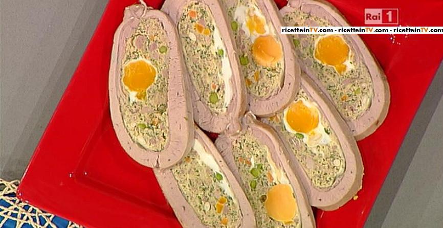 Antonella, stupita per la mole di ingredienti, invita Ivano ad iniziare. Tritiamo la lattuga, dopo averla lavata. Mettiamo a cuocere in padella, con un filo d’olio e della cipolla, la carne, ovvero la salsiccia e la polpa di vitello e vitellone. Nonna Annina irrompe, essendosi ricordata del compleanno del nipotino. Mettiamo a rosolare la lattuga con olio e burro, e dei piselli e carote tagliate a cubetti a bollire in acqua. Tritiamo con il coltello la carne ormai cotta, il prosciutto cotto, la lattuga appassita. Uniamo anche i piselli e la carota, i pinoli ed il parmigiano, un trito di aglio, majorana e prezzemolo, amalgamando il tutto con le uova. Riempiamo la tasca di carne con tutto il ripieno, cucendo le estremità. Avvolgiamo in un canovaccio, chiudendo alle estremità con uno spago da cucina. Immergiamo il fagotto in acqua bollente per un’ora e mezza, ‘pungendo’ con un ago la tasca, per fare uscire eventuali bolle d’aria. Terminata la cottura, togliamo il canovaccio e mettiamo sopra la tasca un peso. Poi la tagliamo a fette. Buon appetito!