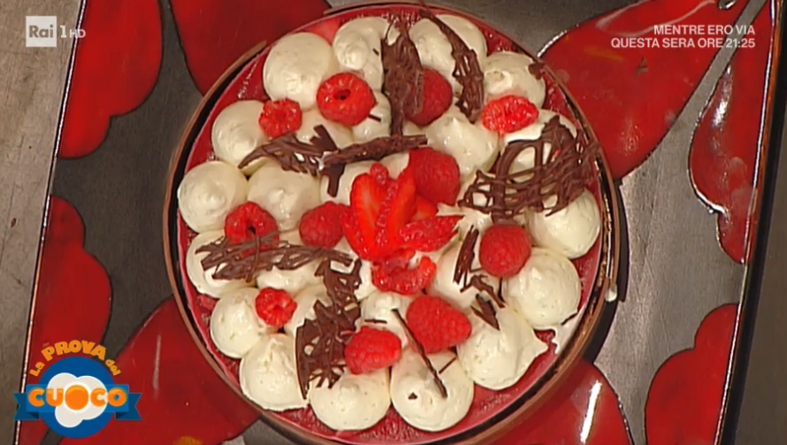 Ricaviamo dei dischi dal biscotto ormai freddo. Inseriamo un disco all’interno di un anello. Spalmiamo sopra un po’ di confettura di lamponi, distribuiamo sopra delle fragole fresche a cubetti e congeliamo. Sformiamo e formiamo sopra degli spuntoni di mousse al cioccolato bianco. Decoriamo con dei lamponi freschi e delle scaglie di cioccolato.