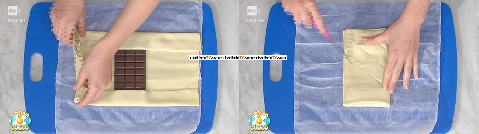 Stendiamo il nostro rotolo di sfoglia già pronta. Meglio se senza olio di palma. Posizioniamo al centro la tavoletta di cioccolato fondente (anche al latte, se preferite). Pieghiamo i lembi di sfoglia sulla tavoletta (foto). Pratichiamo delle incisioni. Spennelliamo con l’uovo sbattuto e spolveriamo con la granella di nocciole. Inforniamo per 20 minuti a 200°.